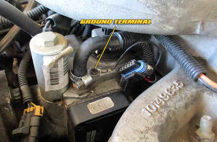 • Disconnect the FSD/PMD ground wire using a T25 Torx bit. It's a tight fit, but a 1/4" drive bit and ratchet can reach the bolt after pushing the fuel line aside gently.