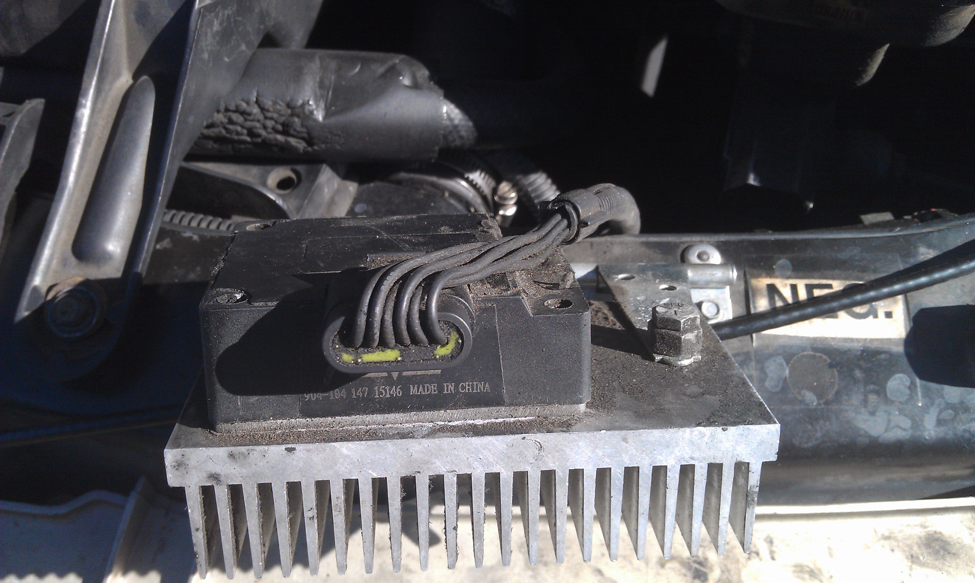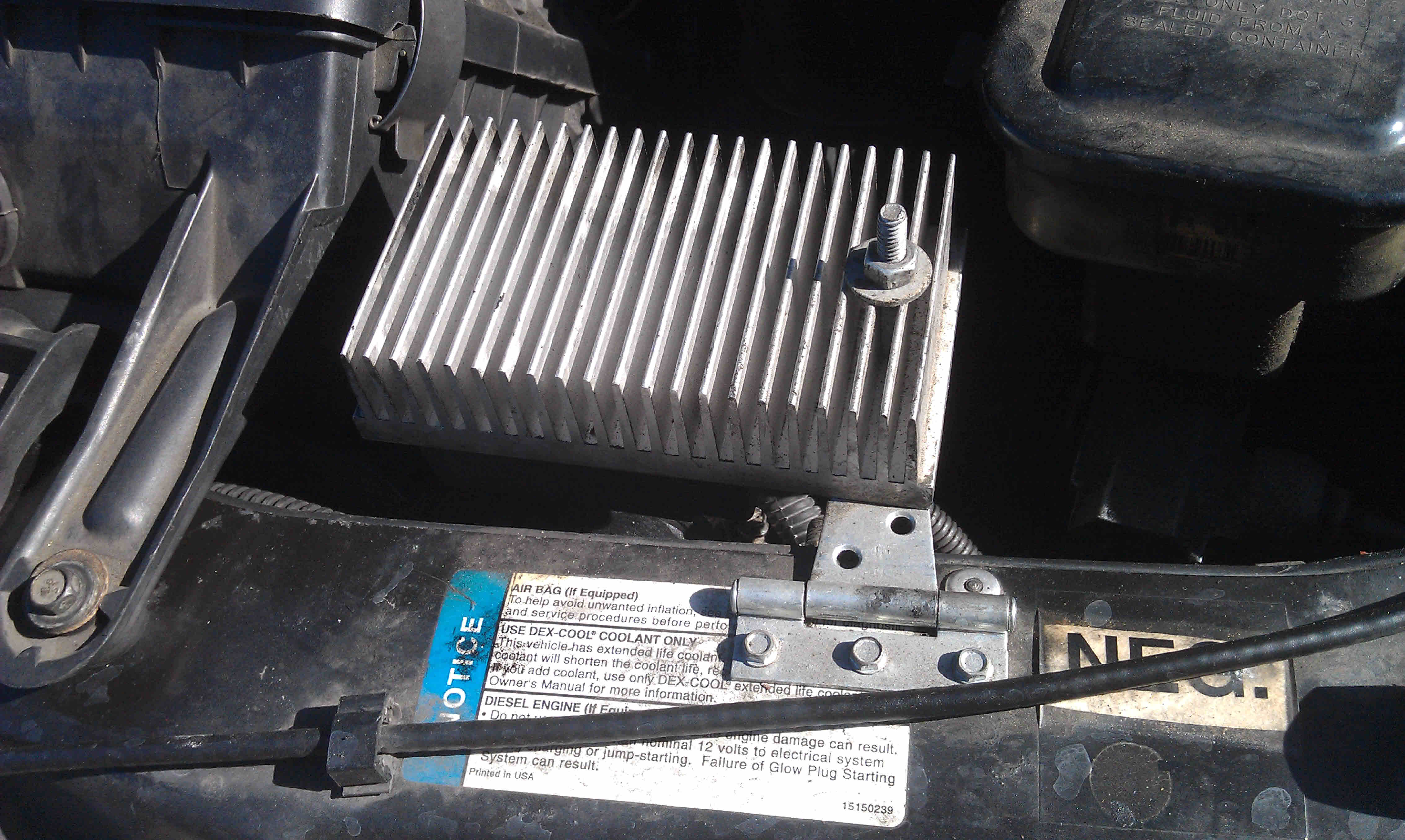 Our relocation kit includes the heat sink and hinge as shown above with three self tapping screws you can mount loosely in a drill and run in carefully, and a short extension cable with a built in resistor and a 66 inch cable to reach the hood area