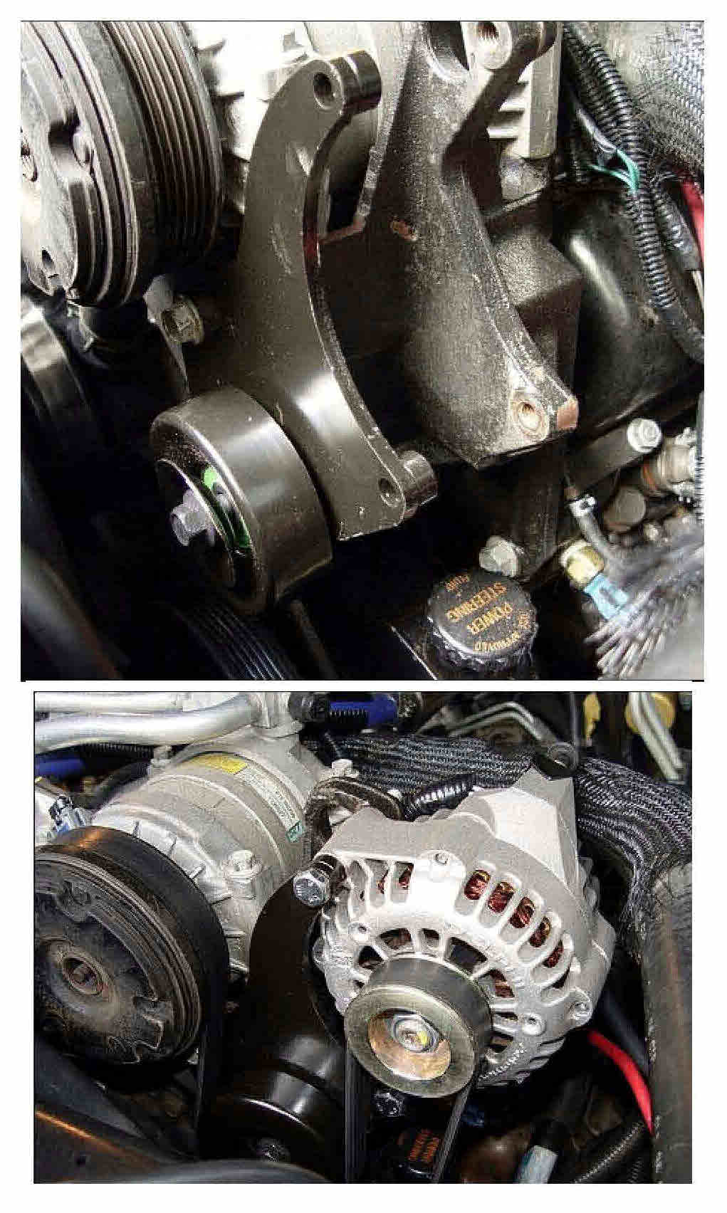 Dual alternator plate for GM V-8 and V-6 engines with this drivers side air conditioner mount serpentine belt. Actual plate picture not shown. Fits most 1999 to present. V-8 and V6 engines with the drivers side A/C pump mount. This version is for the vans or units with a remote Power Steering mount tank Check your engine to see if you have a steel engine lift ring similar as shown in the upper right (rear) of the picture except it will not have the two tapped holes as shown, but willhave a oval hole in a steel lift ring and is not cast. PLATE ONLY - (the black part in the front of the upper picture) you will need to source the idler pulley and other parts - a bone yard will do fine for the pulley and spare alternator often. A CS-144 alternator will also fit with the same mounting holes. GM wiring schematic diagram and parts list is included - including recommended belt size. No alternator mount hole spacers welded on - washers instead.